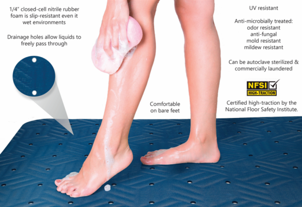 Unlike many wet area mats, Aqua mats are constructed with durable closed-cell nitrile foam, providing a soft and comfortable surface for bare feet. Aquagrip mats provide a safe, clean, and comfortable surface to stand in locker rooms, showers, and around swimming pools and hot tubs.